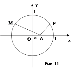 Введем прямоугольную систему координат с началом в центре окружности. Пусть хорда МР параллельна оси Ох, а точка А принадлежит диаметру (рис. 11). Обозначим расстояние ОА через а, а расстояние от точки Р до оси Ох через b. Тогда точка А имеет координаты (а, 0). Точки Р и М принадлежат окружности с центром в начале координат и радиусом равным 1, следовательно их координаты удовлетворяют уравнению данной окружности