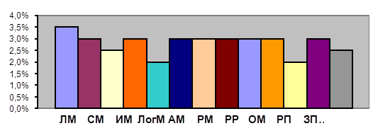 Проведя качественный анализ результатов, мы видим, что у учащихся данного класса разные уровни сформированности психических процессов и эмоционально волевой сферы. Общая картина данных класса выглядит немного иначе. Многие измеряемые параметры, расположены в зоне средних значений. Но есть и те, которые расположены ниже этих границ: абстрактное и интуитивное мышления, скорость переработки информации, зрительно-моторная координация (Рис.1).