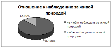 Из анализа диаграмм видно, что большинство учеников любят наблюдать за живой природой и любят при этом аквариумных рыбок (87,5% и 75% соответственно). При этом около половины учеников (52,5%) готовы изучать учебный материал с помощью опытов и наблюдений. Однако 50% учеников считают, что лабораторных работ в курсе "Зоология" проводится достаточно. Около половины детей из этих 50% считают, что работ достаточно, т.к. понимают, что далеко не на все работы в школе есть оборудование, как того хотелось бы.
