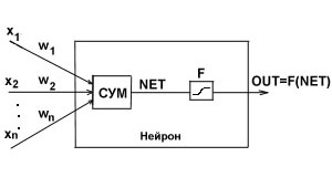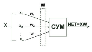 представлена модель, реализующая эту идею. Хотя сетевые парадигмы весьма разнообразны, в основе почти всех их лежит эта конфигурация. Здесь множество входных сигналов, обозначенных x1, x2, x3 .xn, поступает на искусственный нейрон. Эти входные сигналы, в совокупности обозначаемые вектором X, соответствуют сигналам, приходящим в синапсы биологического нейрона. Каждый сигнал умножается на соответствующий вес w1, w2, w3 .wn, и поступает на суммирующий блок, обозначенный СУМ. Каждый вес соответствует "силе" одной биологической синоптической связи. (Множество весов в совокупности обозначается вектором W). Суммирующий блок, соответствующий телу биологического элемента, складывает взвешенные входы алгебраически, создавая выход, который мы будем называть NET. В векторных обозначениях это может быть компактно записано следующим образом.