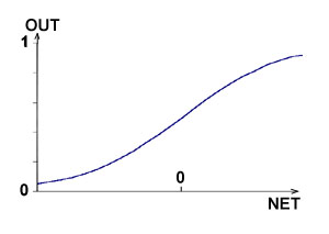 блок, обозначенный F, принимает сигнал NET и выдает сигнал OUT. Если блок F сужает диапазон изменения величины NET так, что при любых значениях NET значения OUT принадлежат некоторому конечному интервалу, то F называется сжимающей функцией. В качестве сжимающей функции часто используется логистическая или сигмоидальная (S-образная) функция, показанная на рис.3. Эта функция математически выражется как F(x)=1/(1+e-x) . Таким образом,