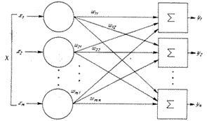 Отметим, что вершины круги слева служат лишь для распределения входных сигналов. Они не выполняют каких-либо вычислений, и по этой причине они обозначены кругами чтобы отличать их от вычисляющих нейронов обозначенных квадратами Каждый элемент из множества входов X отдельным весом соединен с каждым искусственным нейроном. А каждый нейрон выдает взвешенную сумму входов в сеть. В искусственных и биологических сетях многие соединения могут отсутствовать, все соединения показаны в целях общности. Могут иметь место также соединения между выходами и входами элементов в слое.