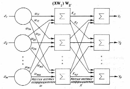 Как видно из публикаций, нет общепринятого способа подсчета числа слоев в сети. Многослойная сеть состоит из чередующихся множеств нейронов и весов. Ранее в связи с рис.1.5 уже говорилось, что входной слой не выполняет суммирования. Эти нейроны служат лишь в качестве разветвлений для первого множества весов и не влияют на вычислительные возможности сети. По этой причине первый слой не принимается во внимание при подсчете слоев, и сеть, подобная изображенной на рис. 1.5, считается двухслойной, так как только два слоя выполняют вычисления. Далее, веса слоя считаются связанными со следующими за ними нейронами. Следовательно, слой состоит из множества весов со следующими за ними нейронами, суммирующими взвешенные сигналы.