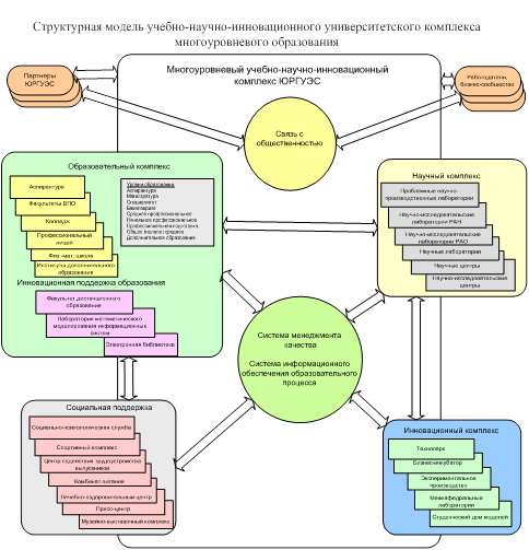 В состав структурной модели учебно-научно-инновационного университетского комплекса многоуровнего образования, созданного на базе ЮРГУЭС, входят: