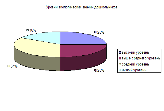 После проведения диагностики экологических знаний детей по параметрам неживая природа, многообразие животного и растительного мира, сезонные изменения, природа и человек получили следующие результаты. Итак, 1 уровень (низкий) – 2 человека, что составляет 16%; 2 уровень (средний) -4 человека, 34%; 3 уровень (выше среднего) – 3 человека, 25%; 4 уровень (высокий) -3 человека, 25%.