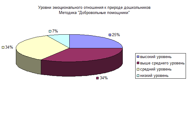 В результате проведения методики «Добровольные помощники» были получены следующие результаты: 1 уровень (низкий) – 1 человек, что составляет 7%; 2 уровень (средний) - 4 человека, 34%; 3 уровень (выше среднего) – 4 человека, 34%; 4 уровень (высокий) -3 человека, 25%.