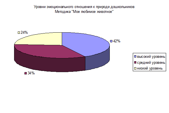 Высокий уровень составляет 42 % - 5 человек. Данные рисунки характеризуются использование широкой цветовой гаммы, строение изображаемого животного передано достоверно, эмоциональный настрой рисунка положительный.