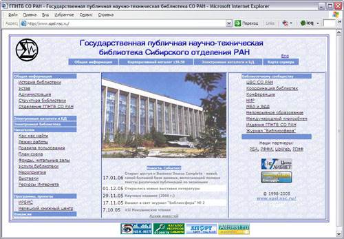 Как и большинство современных информационно-библиотечных учреждений, для оптимизации своей работы и обслуживания читателей ГПНТБ СО РАН активно использует информационные технологии. Познакомиться со всеми направлениями деятельности ГПНТБ СО РАН и ее электронными ресурсами пользователи могут на сайте библиотеки.