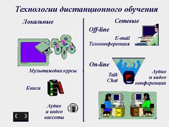Коммуникационные технологии можно разделить на два типа - on-line и off-line. Первые обеспечивают обмен информацией в режиме реального времени, то есть сообщение, посланное отправителем, достигнув компьютера адресата, немедленно направляется на соответствующее устройство вывода. При использовании off-line технологий полученные сообщения сохраняются на компьютере адресата. Пользователь может просмотреть их с помощью специальных программ в удобное для него время. В отличие от очного обучения, где диалог ведется только в режиме реального времени (on-line), в ДО он может идти и в отложенном режиме (off-line).