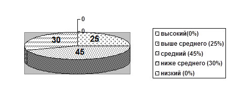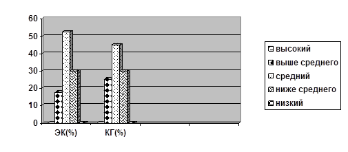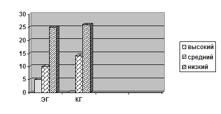 Из таблиц 3 и 4 видно, что в экспериментальной группе на высоком уровне 5 человек, а в контрольной группе нет ни одного. На среднем уровне в обеих группах количество человек незначительно отличается (ЭГ – 10 человек, КГ – 14), а на низком уровне в экспериментальной группе на одного человека меньше (25 человек).