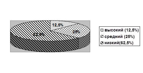 Из таблицы 3 мы видим, что уровень развития зрительно-двигательной координации у детей старшего дошкольного возраста в экспериментальной группе на констатирующем этапе низкий (62,5%); присутствует значительное количество детей с среднем уровнем (25%); с высоким уровнем 12,5%. Наглядно полученные результаты отражены на рис. 4.