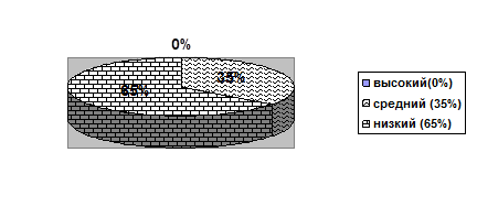 Из таблицы 4 мы видим, что уровень развития зрительно-двигательной координации у детей старшего дошкольного возраста в контрольной группе на констатирующем этапе, также как и у детей экспериментальной группы, в основном низкий (65%); детей со средним уровнем развития больше, чем в экспериментальной группе на 10% – 35%; детей с высоким уровнем развития зрительно-двигательной координации нет. Наглядно полученные результаты отражены на рис. 5.