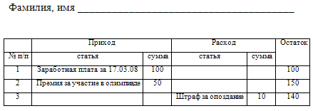 В личном лицевом счете указывается, за что получена данная сумма игровых денег и на какие цели она расходуется, если расходуется вообще. При заполнении счета ученик должен соблюдать правило "корреспондирующей записи" – в одной строке счета производится запись только одной суммы, которая либо поступила на счет, либо снята со счета при расходе денег. После каждой операции прихода и расхода денег вычисляется остаток денег на счете.
