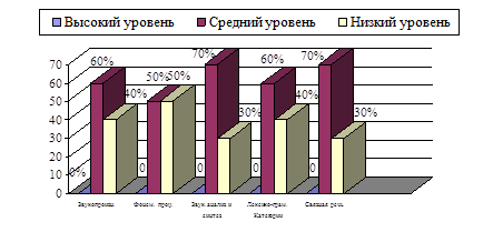 При обследовании уровня сформированности фонематических процессов высокого уровня их развития в группе детей выявлено не было. По 5 ребят (по 50%) показали наличие среднего и низкого уровней сформированности фонематических процессов.