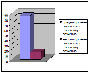 Результаты, полученные на этапе констатирующего эксперимента с помощью методики Керна-Йерасека на выборке учащихся первого класса «А» средней школы № 61, позволяют сделать вывод о том, что уровень готовности к школьному обучению у 85,7% детей средний и у 14,3% высокий – рисунок 1.