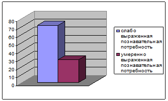 Как показали результаты, полученные на этапе констатирующего эксперимента с помощью методики «Познавательная потребность» В.С. Юркевича, у 71,4% испытуемых с точки зрения их учителя - слабо выраженная познавательная потребность и у 28,6% первоклассников – умеренно выраженная познавательная потребность – рисунок 2.