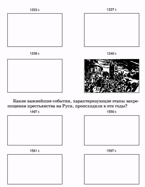 В «Рабочей тетради по истории России» мы также предложили ряд познавательных заданий для работы с хронологией, в том числе и с использованием лент времени и других наглядных средств, вычерчиваемых на доске. Один из таких приемов — это иллюстрирование даты учащимися, когда они придумывают самостоятельно значок, картинку, отражающую данное событие (см. рис. 5). Другой прием — распределение дат по темам или периодам связан с составлением хронологических рядов или комплексов. Третий прием — это составление рядов или комплексов. Для проверки знания дат мы в рабочих тетрадях предлагаем задания с соединительными стрелками: соединяем даты с событиями, местами, именами, с ними связанными.