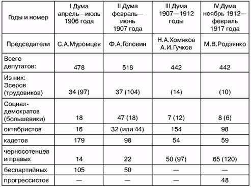 Статистические таблицы можно также использовать на уроке истории для анализа уровня жизни тех или иных слоев населения. Такие таблицы и задания к ним предложили в своем учебнике Л.Н.Жарова и И.А.Мишина[18]. Таблицы с цифрами целесообразно использовать и при оценке какого-либо исторического явления или события. Наглядно мы можем это продемонстрировать на примере таблицы «Состав Государственной Думы в России» (рис.7).