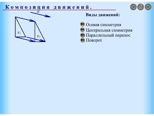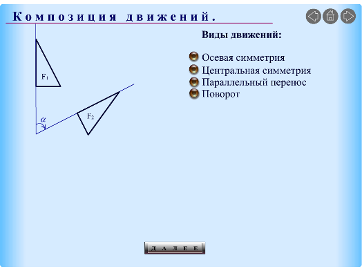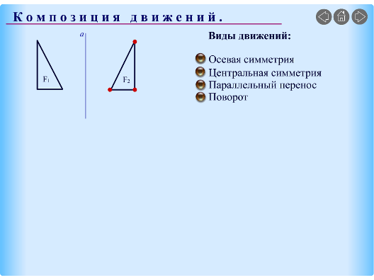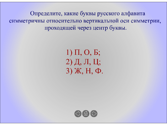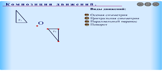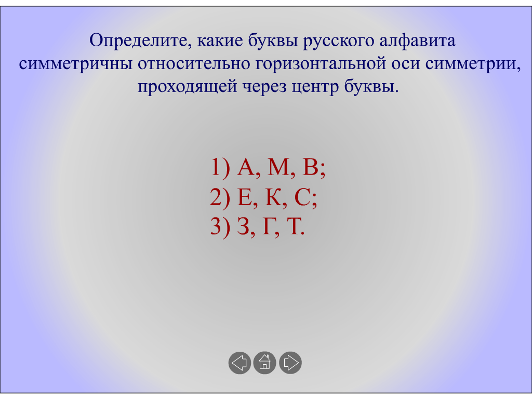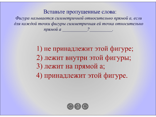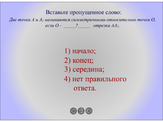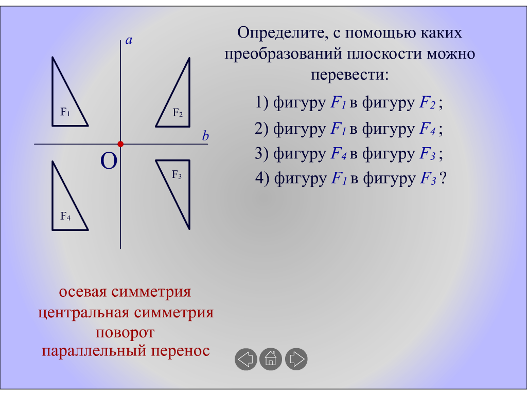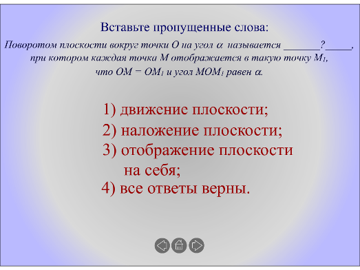 Тестовая часть мультимедийного пособия содержит 10 вопросов, в каждом из которых по 4 варианта ответа. Сначала идет блок, состоящий из пяти практических заданий. Первые четыре на определение преобразования плоскости и последнее на определение точки, симметричноц данной.