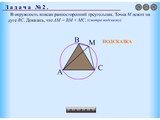 Домашнее задание состоит из заданий, аналогичных представленным в мультимедийном пособии. После проверки учителем домашнего задания, ученик, если допустил ошибки, выполняет работу над ошибками, а затем выполняет самостоятельную работу, которая состоит из аналогичных заданий, которые выполнялись учеником и за компьютером, и дома. Проверив эту самостоятельную работу, учитель выставляет за нее оценку. Ниже рассмотрим применение мультимедийного пособия на уроках геометрии в качестве наглядного вспомогательного средства изучения темы.