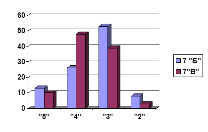 Сравнивая результаты контрольных работ двух классов, видим, что уровень качества знаний практически на одном уровне. Ученики хорошо овладели темами, прошедшими за первую и вторую четверть. Но все же уровень качества знаний в 7 «Б» классе чуть выше, чем в 7 «В» классе. Выбираем экспериментальный и контрольный класс. Экспериментальным будет 7 «Б», а контрольным 7 «В»
