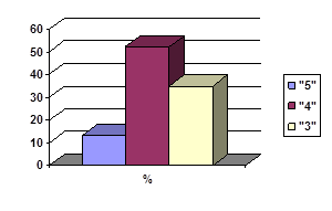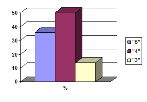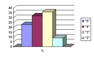 На первом этапе зачетного урока у ребят был мини – экзамен (опрос по билету), по вопросам: координатная прямая; координатная плоскость; линейное уравнение с одной переменной; количество корней уравнения; линейное уравнение с двумя переменными; график линейного уравнения с двумя переменными; линейная функция и ее график; прямая пропорциональность и ее график. Результаты получились следующие: