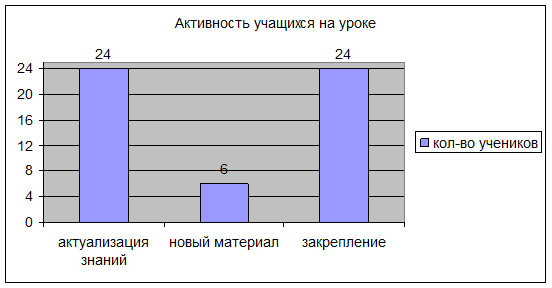 Изложение нового материала не вызывало у учащихся вопросов, поэтому к объяснению новой темы привлекались ученики, т.е. были активны 6 обучаемых. Так как тема обучаемым показалась не сложной, то при закреплении материала были активны все, т.е. 24 человека.