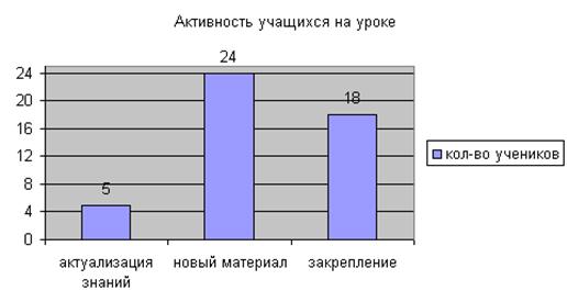 Таким образом, можно сказать, что на протяжении всего урока был активен весь класс, но при закреплении материала не всем выпала возможность ответить.