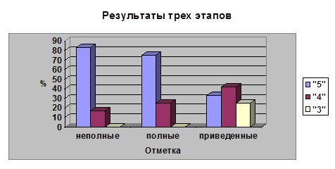 Сравнив результаты трех этапов, можно увидеть, что на первом и третьем этапах преобладающей отметкой является "5", результаты показали высокий уровень знаний. А на третьем этапе уровень знаний хуже, чем в предыдущих этапах. Этому повлияло то, что контрольная работа была комплексная, где включались решения квадратных уравнений различных видов. По результатам контрольной работы видно, что учащиеся умеют: