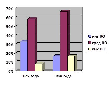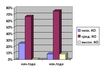 Из рисунка 2 заметно возросшее увеличение показателей среднего КО, в конце учебного года, увеличение высокого и значительное уменьшение низкого КО.