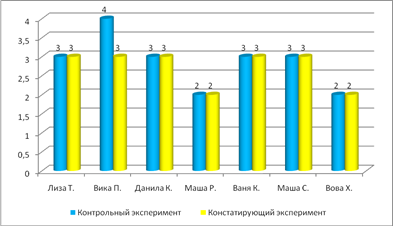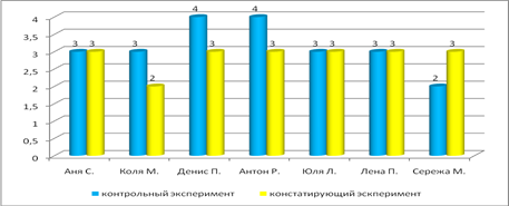 Как видно из гистограмм, в экспериментальной группе произошли изменения в уровнях сформированности игровых навыков. А именно, двое детей Денис и Антон, улучшили свои результаты до высокого уровня сформированности. Двое детей поднялись с уровня ниже среднего до среднего уровня. Трое детей, по–прежнему остались на прежних уровнях сформированности.