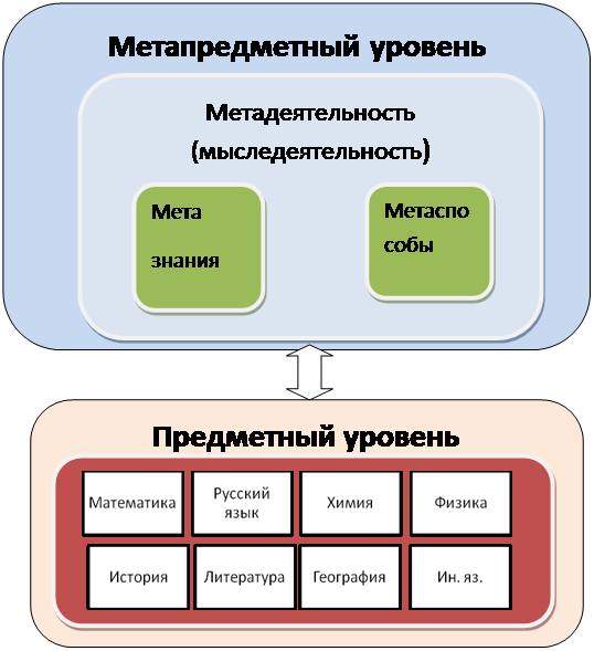 Метапредмет — учебный предмет нового типа, в основе которого лежит мыследеятельностный тип интеграции учебного материала. Метапредметы — это новая образовательная форма, которая выстраивается поверх традиционных учебных предметов, это учебный предмет нового типа, в основе которого лежит мыследеятельностный тип интеграции учебного материала, каковыми являются метазнание, метаспособы, метадеятельность. В науке и педагогической практике все больше сторонников находит мыследеятельностная педагогика (Ю.В.Громыко), которая является продолжением теории развивающего обучения В.В.Давыдова. Она направлена на формирование столь важного сейчас теоретического мышления и универсальных способов деятельности. Идея состоит в том, что дети исследуют принципы построения их мышления в процессе порождения новых знаний, самоопределения в проблемной ситуации с помощью особых курсов – метапредметов. Блок метапредметов надстраивается над преподаванием традиционных учебных предметов. В этом блоке у учащихся формируются метазнания и метаспособы. В качестве метапредметов Громыко Ю.В. были выделены: «Знание», «Знак», «Проблема», «Задача».