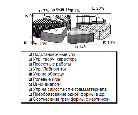 Рис. 1. Диаграмма частотности упражнений по обучению коммуникативной грамматике (по УМК Кузовлева В.П., 7 класс)