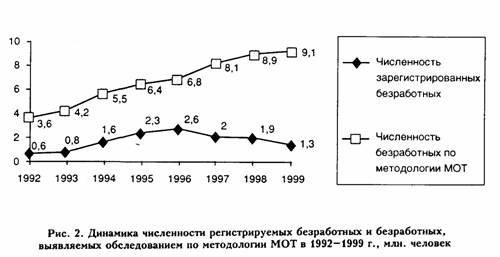 Регистрируемая безработица. Российской особенностью второй половины 1990-х годов стала разнонаправленная динамика показателей общей безработицы (рассчитываемой по методологии МОТ) и регистрируемой безработицы. С 1996 г. регистрируемая безработица сокращалась, а общая — росла. В результате к концу 1999 г. разрыв показателей достиг семикратной величины.