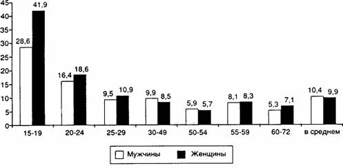 Структура безработицы по социальным группам. Наиболее высокий уровень безработицы наблюдается в последние годы среди молодежи. По данным обследования населения по проблемам занятости Госкомстата России, в 2000 г. почти треть обследованных в возрасте 15-19 лет и около 16% в возрасте 20-24 года