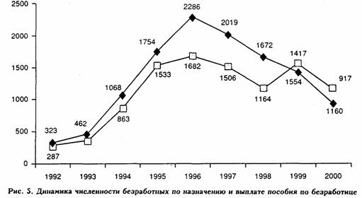 В 1995 г. ситуация в экономике изменилась: широким фронтом развернулась приватизация предприятий, стали рушиться хозяйственные связи внутри страны, а регистрируемая безработица возросла в 2 раза. Эти явления не могли не сказаться на деятельности Государственной службы занятости населения. К середине 1995 г. появился феномен дефицита Фонда занятости, имевший своим следствием сокращение финансирования активных программ, в счет увеличения финансирования программ материальной поддержки безработных. Далее, в 1996-1998 гг. этот процесс интенсивно развивался. Усугубил течение данного процесса момент снижения отчислений страховых взносов в Фонд занятости с 2% до 1,5% фонда оплаты труда предприятий.