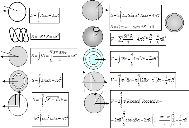 Задание : из каких геометрических соображений сконструированы интегралы для вычисления длины окружности, площадей круга и шара, объёма шара?