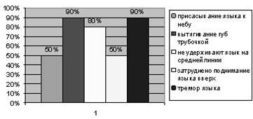 Артикуляционный аппарат характеризуется (приложение 2 таблица №4): у 90% детей состояние губ и зубов в норме; у 10% губы малоподвижные, зубы мелкие, отсутствуют передние резцы, глубокий прикус; у 40% детей высокое или готическое небо; у 80 % детей наблюдается тремор языка, затруднено поднимание языка вверх, повышенная саливация, что свидетельствует об органическом поражении головного мозга.
