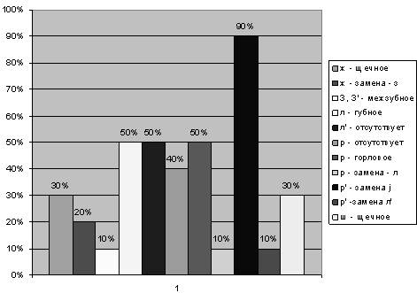 [р] – отсутствует – 40%, горловое – 50%, замена [л] – 10%;