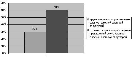 При воспроизведении слов сложной слоговой структуры (приложение 2 таблица №9) у 30 % детей наблюдаются пропуски, замены звуков. Слоговую структуру слова сохраняют. Сложности возникают у 60 % детей. Результаты диагностики можно отразить в диаграмме:
