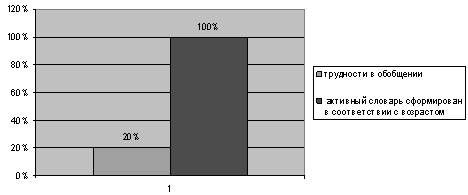Активный словарный запас (приложение 2 таблица №10) достаточный по объему, дифференцированный, точный. Словарный запас в пределах нормы. Обобщающие понятия на стадии формирования. Результаты диагностики можно отразить в диаграмме: