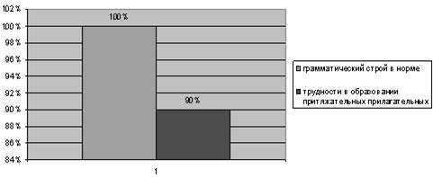 Грамматический строй речи (приложение 2 таблица №11) в норме. Словообразованием и словоизменением дети владеют в соответствии с возрастом (у 90 % детей затруднения в образовании притяжательных прилагательных). Результаты диагностики можно отразить в диаграмме: