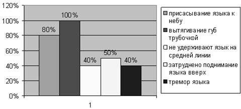 Состояние артикуляционной моторики (приложение 2 таблица №5) характеризуется: движения языка не точные, не полного объема, язык в гипертонусе. Слабо развита артикуляционная моторика. Затруднено поднимание языка вверх. Наблюдается гиперсаливация. Результаты можно отобразить следующей диаграммой: