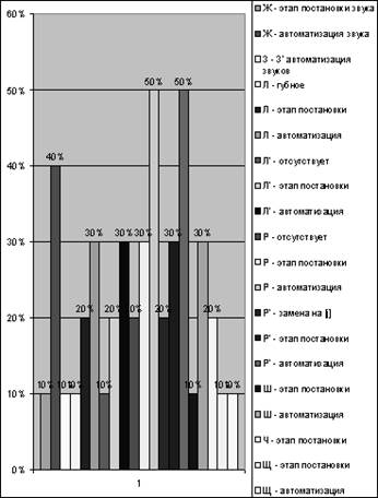 [л’] – отсутствует – 10%; этап постановки – 20%; автоматизация – 30%;