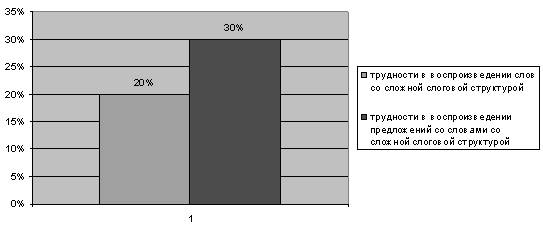 При воспроизведении слов сложной слоговой структуры у 20 % детей наблюдаются пропуски, замены звуков (приложение 3 таблица №17). Слоговую структуру слова сохраняют. Сложности возникают у 30 % детей. Результаты диагностики можно отразить в диаграмме: