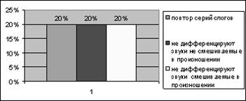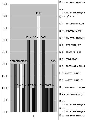 Анализ результатов обследования состояния звукопроизношения показал (приложение 4 таблица №21), что у детей нарушены следующие звуки: [ж] – автоматизация звука– 20%; дифференциация звука – 20%;
