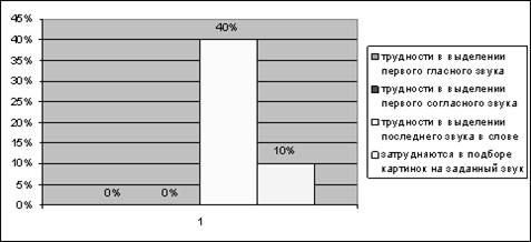 Навыки звукового анализа и синтеза на стадии формирования (приложение 4 таблица №23). 100% детей выделяют первый гласный и согласный звуки в слове, трудности в выделении последнего звука в слове возникают у 40% детей, и подборе картинок на заданный звук у 10% детей. Результаты диагностики можно отразить в диаграмме: