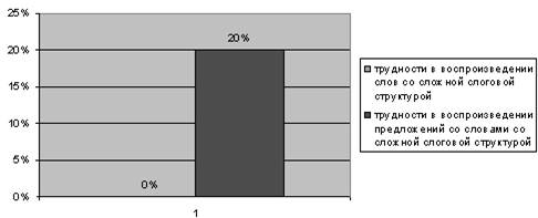При воспроизведении слов сложной слоговой структуры у 100 % детей не наблюдается пропусков, замен звуков (приложение 4 таблица №24). Слоговую структуру слова сохраняют. Сложности возникают у 20 % детей, при воспроизведении предложений со словами со сложной слоговой структурой. Результаты диагностики можно отразить в диаграмме: