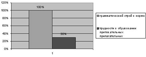 Грамматический строй речи в норме (приложение 4 таблица №25). Словообразованием и словоизменением дети владеют в соответствии с возрастом (у 30 % детей затруднения в образовании притяжательных прилагательных). Результаты диагностики можно отразить в диаграмме: