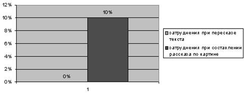 При пересказе используют в основном простые фразы, сложные очень редко (приложение 4 таблица №26). Рассказы составляются в основном краткие, но соответствующие картинке. Затруднения при пересказе и составлении рассказа по картинке испытывали 10 % детей. Результаты можно отразить следующей диаграммой